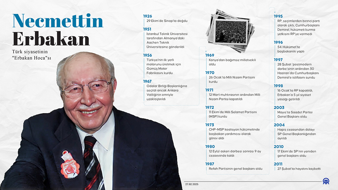 Siyasetinde 'siyonizm' ile mücadelenin ön planda yer aldığı Erbakan, Türk siyaseti ve kamuoyunda 'Filistin davası'nın gündeme gelmesini sağladı. (Grafik: Elif Acar/AA)