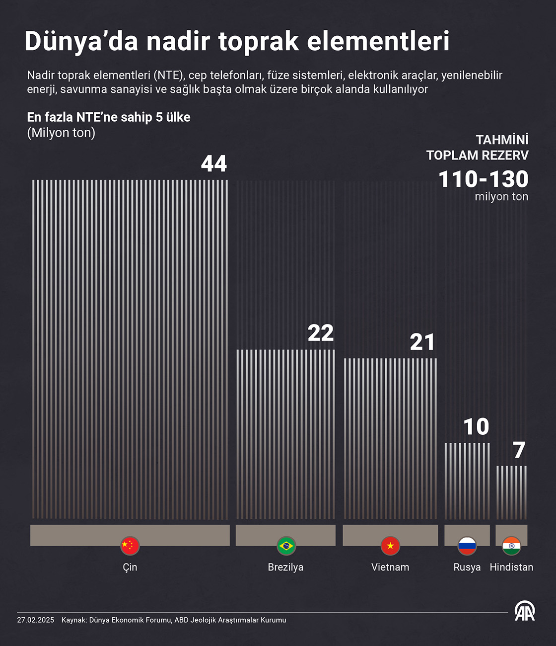 Nadir toprak elementleri (NTE), cep telefonları, füze sistemleri, elektronik araçlar, yenilenebilir enerji, savunma sanayisi ve sağlık başta olmak üzere birçok alanda kullanılıyor. (Grafik: Efnan İpşir/AA)