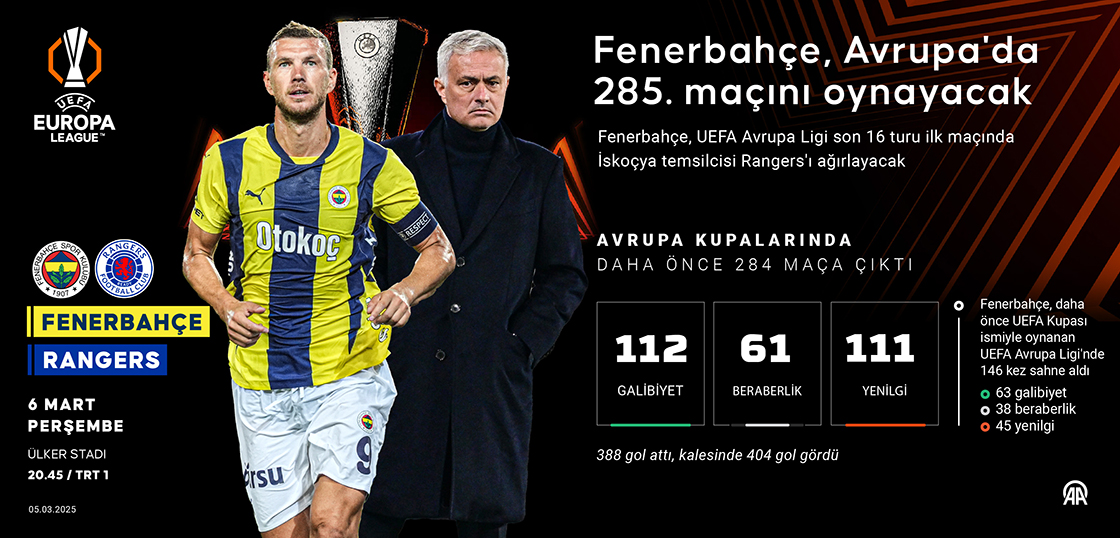 UEFA Avrupa Ligi son 16 turu ilk maçında İskoçya temsilcisi Rangers'ı ağırlayacak Fenerbahçe, Avrupa kupalarındaki 285. karşılaşmasını oynayacak. (Grafik: Kemal Delikmen/AA)