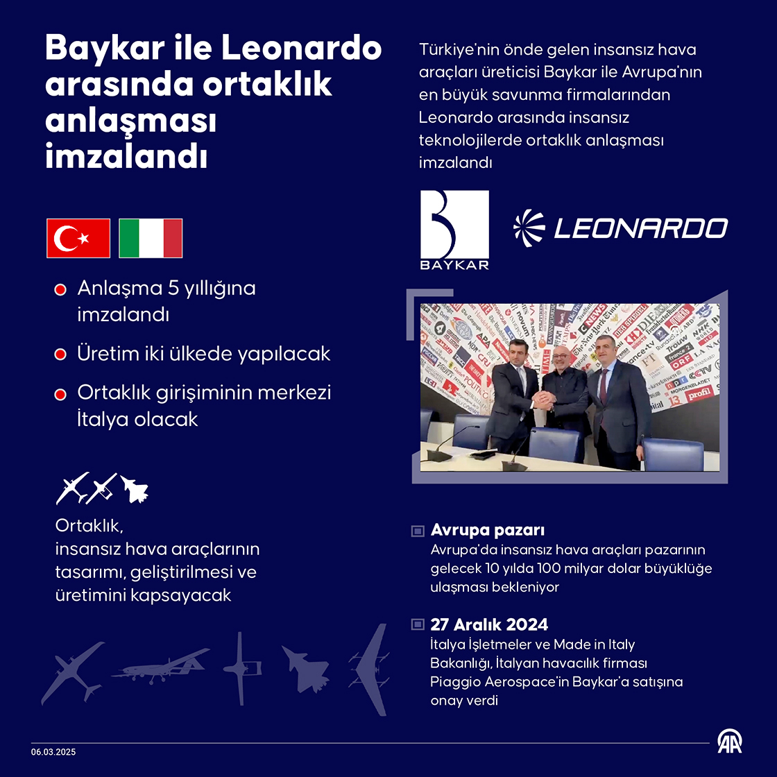 Türkiye'nin önde gelen insansız hava araçları üreticisi Baykar ile Avrupa'nın en büyük savunma firmalarından Leonardo arasında insansız teknolojilerde ortaklık anlaşması imzalandı. (Grafik: Omar Zaghloul/AA)