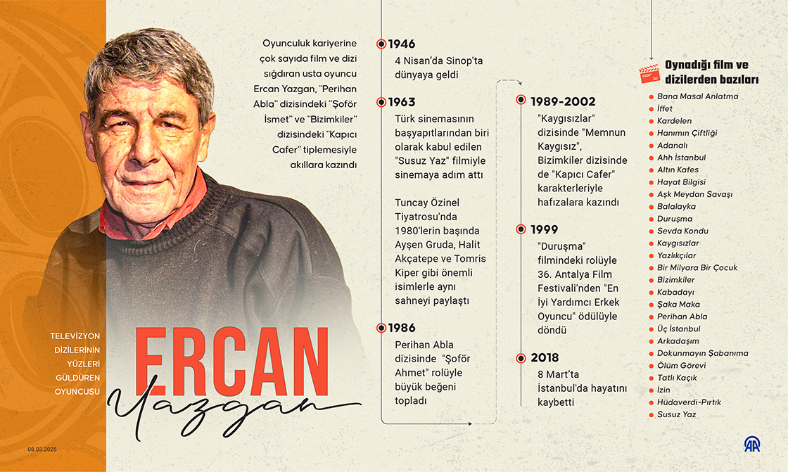 Oyunculuk kariyerine çok sayıda film ve dizi sığdıran usta oyuncu Ercan Yazgan, 'Perihan Abla' dizisindeki 'Şoför İsmet' ve 'Bizimkiler' dizisindeki 'Kapıcı Cafer' tiplemesiyle akıllara kazındı. (Grafik: Ufuk Celal Güzel/AA)