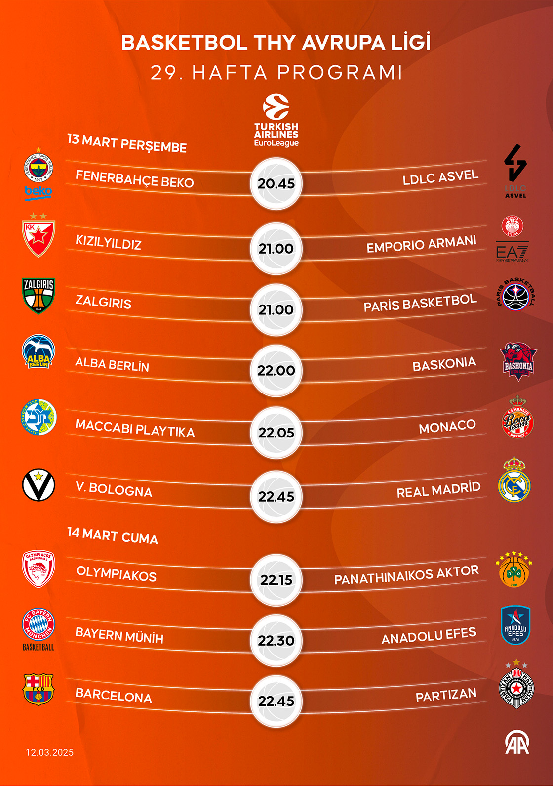 Avrupa basketbolunun kulüpler düzeyindeki bir numaralı organizasyonuna 13 ve 14 Mart'ta oynanacak maçlarla devam edilecek. (Grafik: Kemal Delikmen/AA)