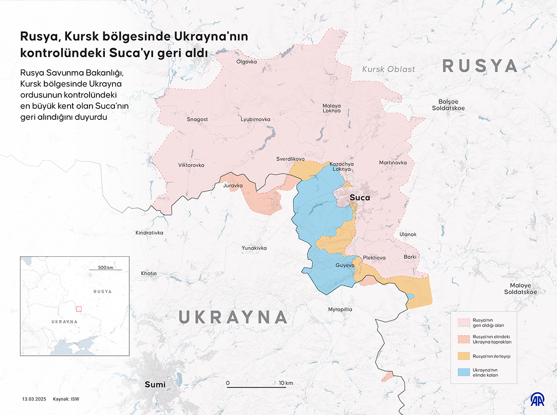 Rusya Savunma Bakanlığı, Kursk bölgesinde Ukrayna ordusunun kontrolündeki en büyük kent olan Suca'nın geri alındığını duyurdu. (Grafik: Bedirhan Demirel/AA)