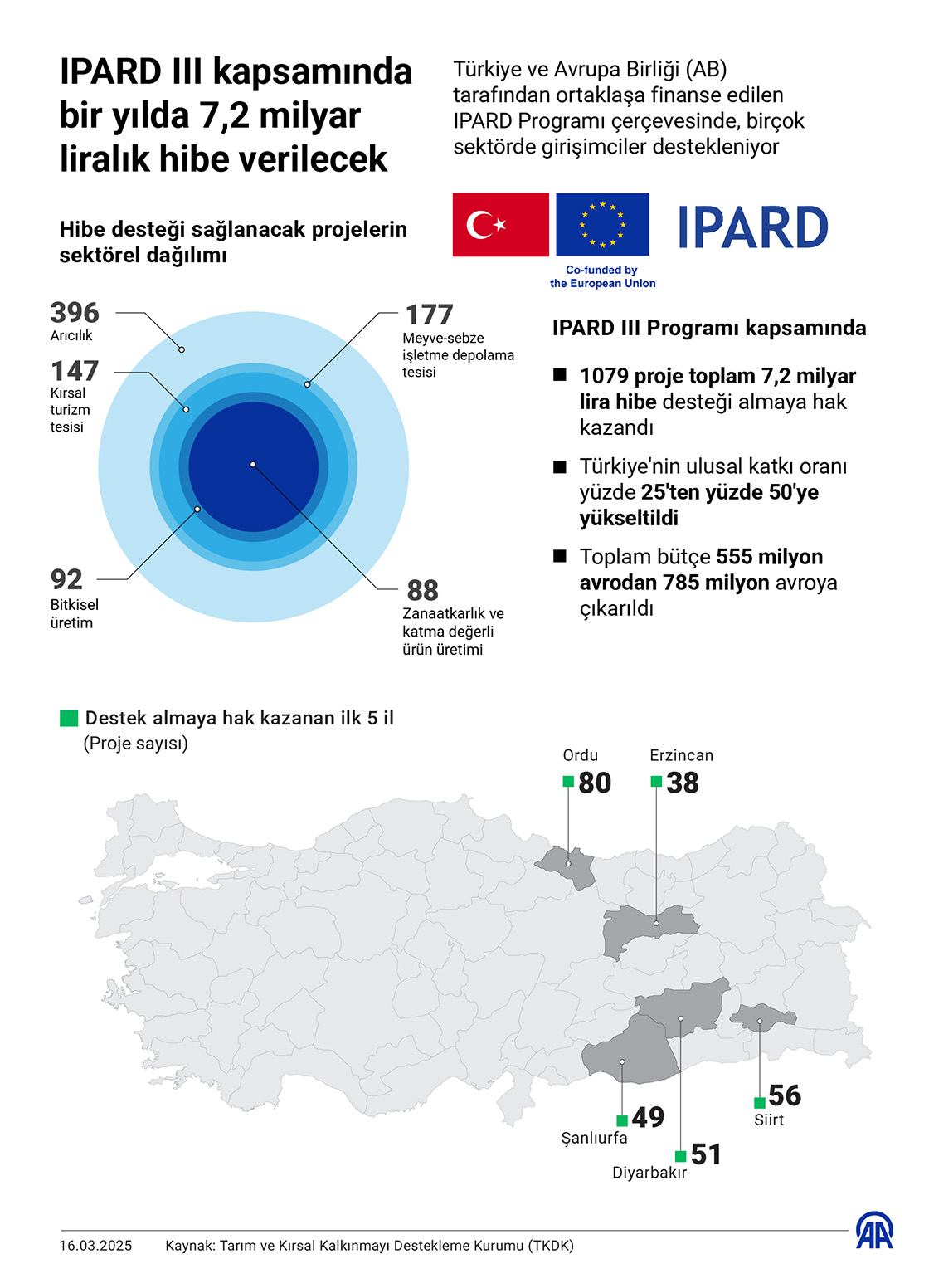 Tarım ve Orman Bakanlığının ilgili kuruluşu Tarım ve Kırsal Kalkınmayı Destekleme Kurumu (TKDK) tarafından yürütülen IPARD III programı kapsamında, bir yılda 1079 proje toplam 7,2 milyar lira hibe desteği almaya hak kazandı. (Grafik: Omar Zaghloul/AA)16 Mart 2025•Güncelleme: 16 Mart 2025