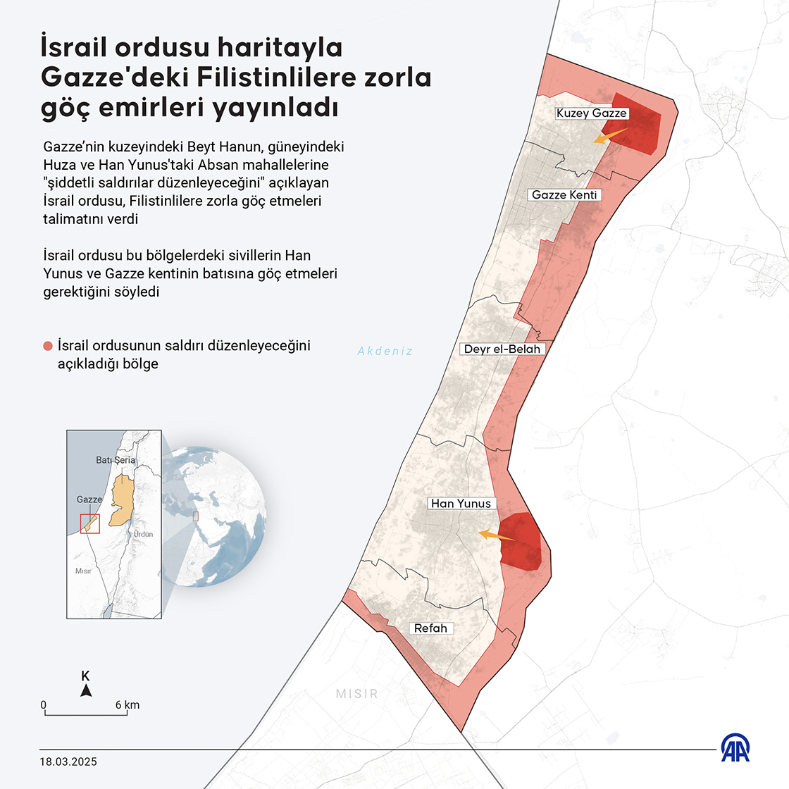 Gazze’nin kuzeyindeki Beyt Hanun, güneyindeki Huza ve Han Yunus'taki Absan mahallelerine 'şiddetli saldırılar düzenleyeceğini' açıklayan İsrail ordusu, Filistinlilere zorla göç etmeleri talimatını verdi. (Grafik: Mehmet Yaren Bozğun/AA)18 Mart 2025•Güncelleme: 18 Mart 2025