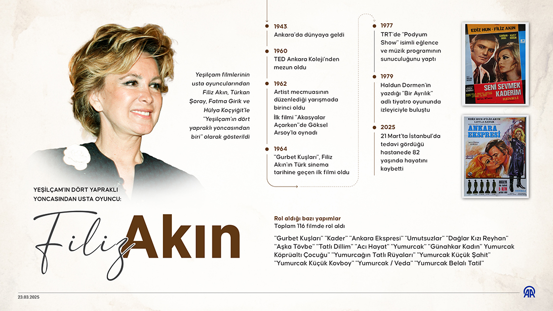 Yeşilçam filmlerinin usta oyuncularından Filiz Akın, Türkan Şoray, Fatma Girik ve Hülya Koçyiğit'le "Yeşilçam'ın dört yapraklı yoncasından biri" olarak gösterildi. (Grafik: Mehmet Yaren Bozğun - AA)
