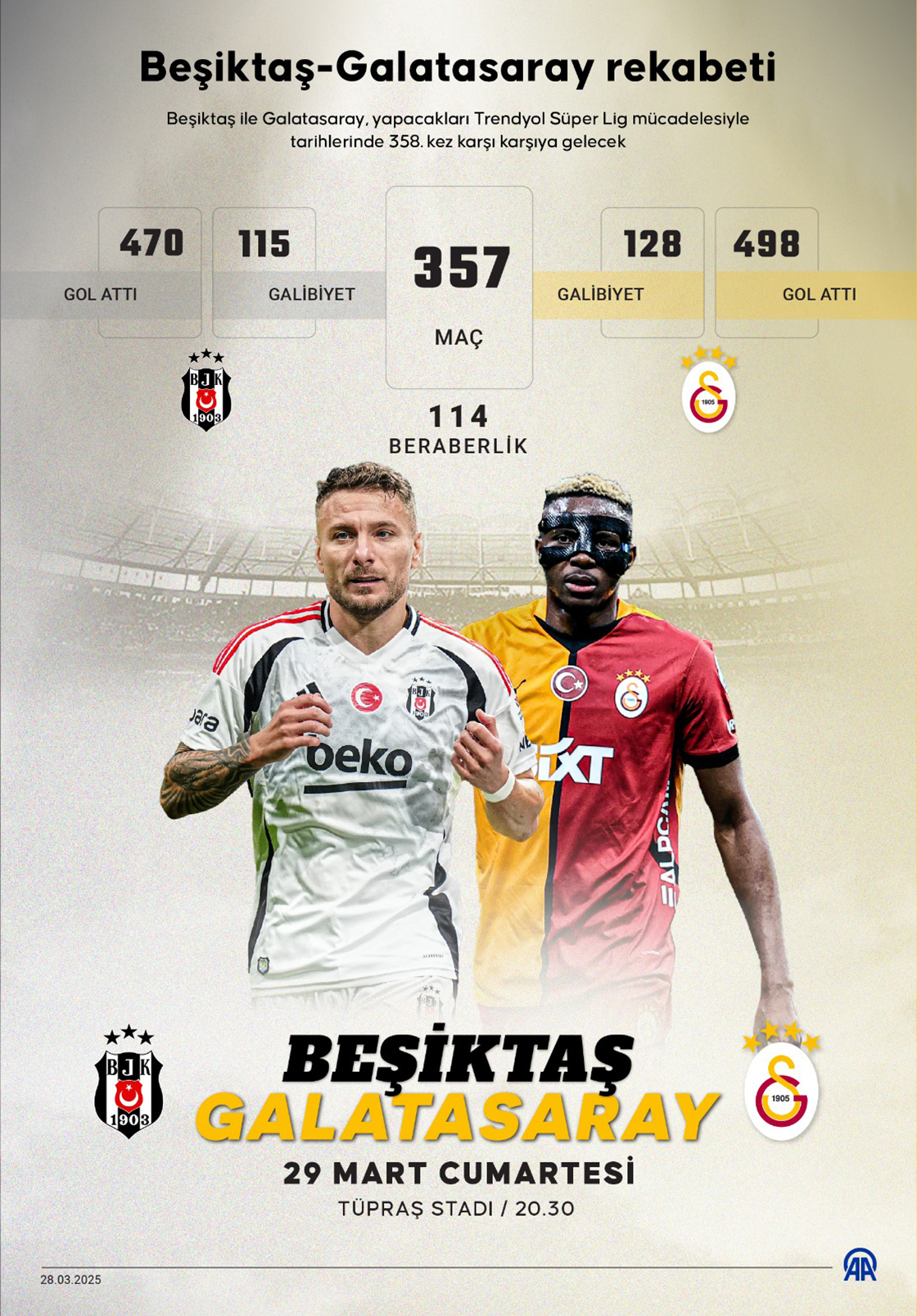 Beşiktaş ile Galatasaray, yapacakları Trendyol Süper Lig mücadelesiyle tarihlerinde 358. kez karşı karşıya gelecek. (Grafik: Ufuk Celal Güzel/AA)