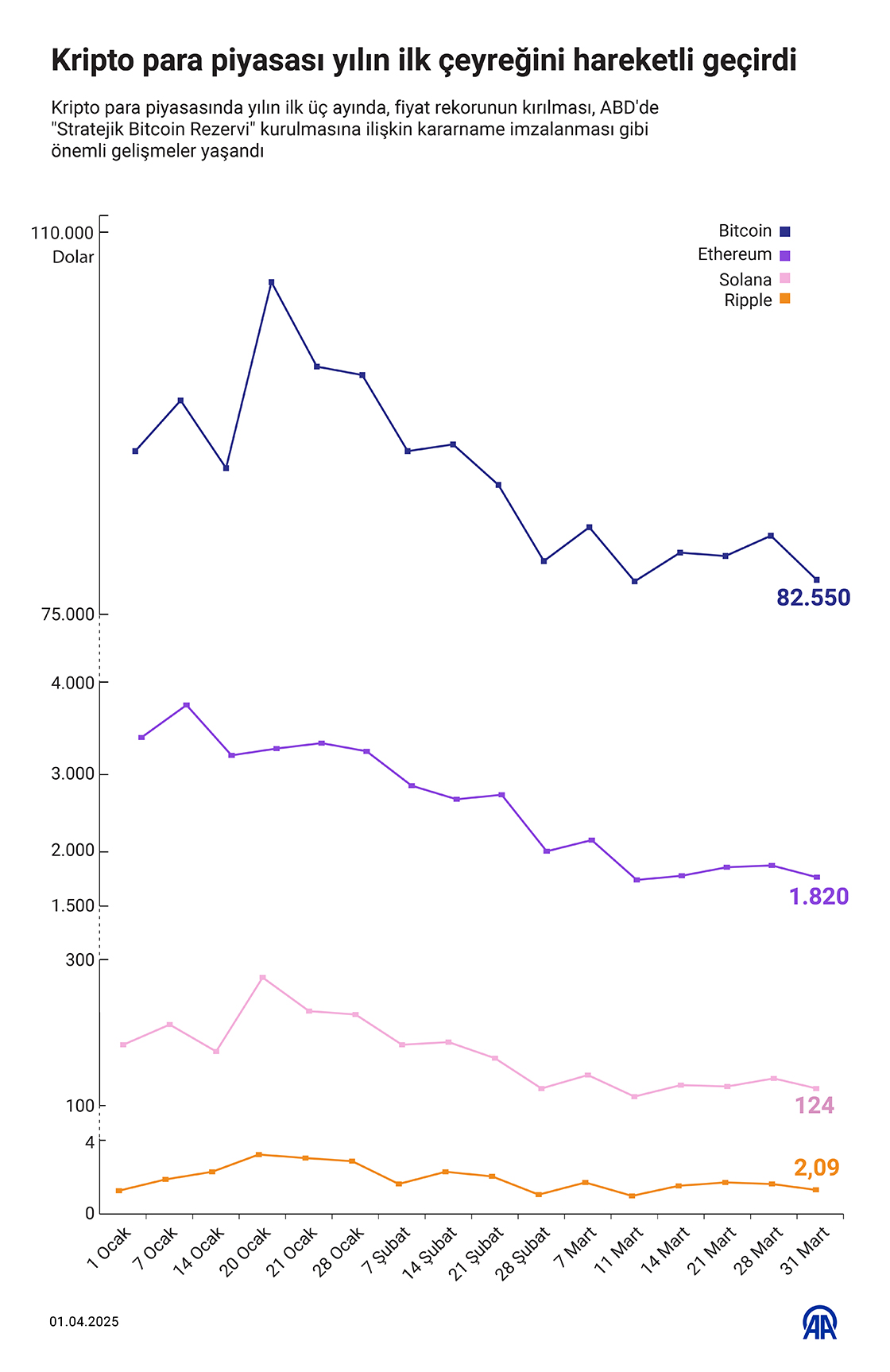 Kripto para piyasasında yılın ilk üç ayında, fiyat rekorunun kırılması, ABD'de 'Stratejik Bitcoin Rezervi' kurulmasına ilişkin kararname imzalanması gibi önemli gelişmeler yaşandı. (Grafik: Efnan İpşir/AA)