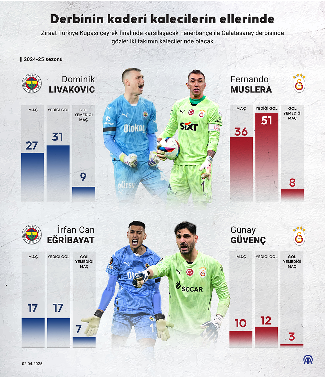 Ziraat Türkiye Kupası çeyrek finalinde karşılaşacak Fenerbahçe ile Galatasaray derbisinde gözler iki takımın kalecilerinde olacak. (Grafik: Elif Acar/AA)