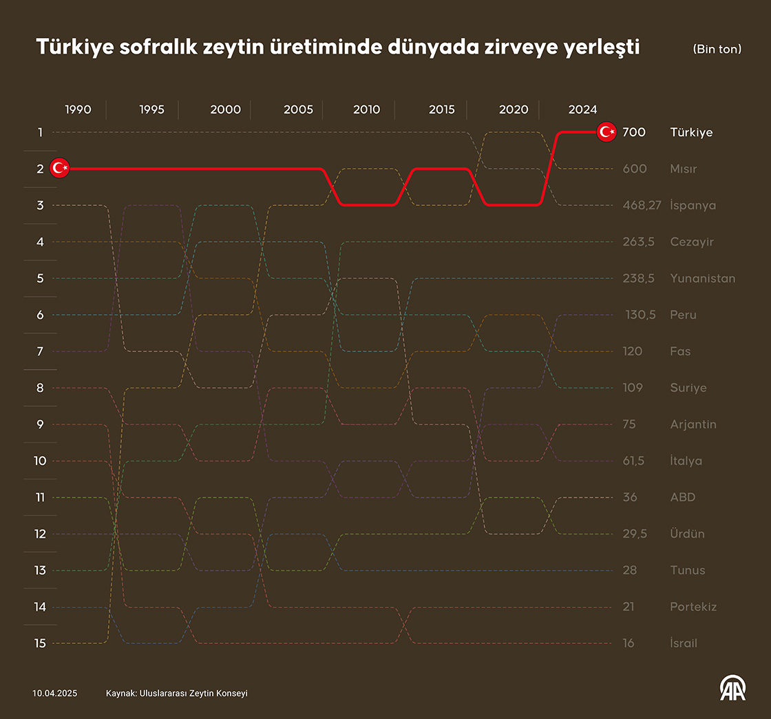 Zeytin üretiminde dünyada önemli bir konumu bulunan Türkiye, 2024/2025 döneminde sofralık zeytin üretiminde Mısır'ı geçerek 700 bin tonla ilk sıraya yükseldi.(Grafik: Yasin Demirci/AA)