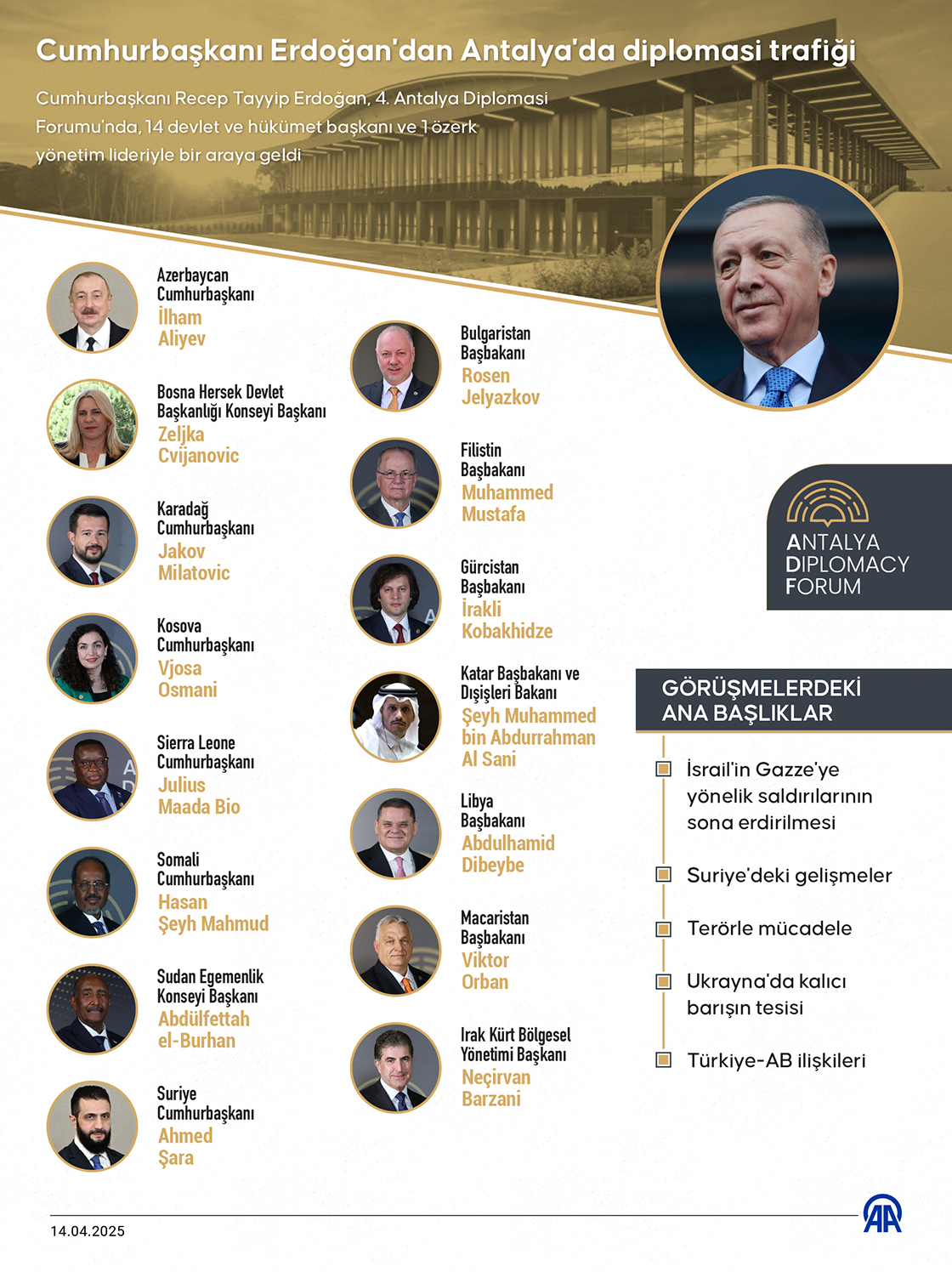Cumhurbaşkanı Recep Tayyip Erdoğan, 'Ayrışan dünyada diplomasiyi sahiplenmek' temasıyla düzenlenen 4. Antalya Diplomasi Forumu'nda, 14 devlet ve hükümet başkanı ve 1 özerk yönetim lideriyle bir araya geldi. (Grafik: Ufuk Celal Güzel/AA)
