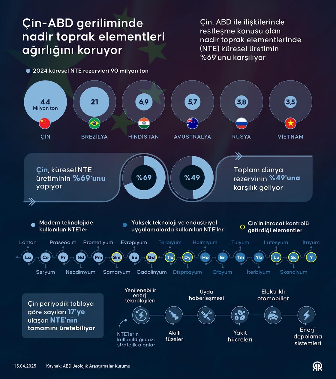 Nadir toprak elementleri (NTE), Çin-ABD geriliminde karşılıklı restleşme aracı olarak öne çıkarken, Çin'in bu alandaki rezervi, üretimi ve ihracat politikaları dikkati çekiyor. (Grafik: Mehmet Yaren Bozğun/AA)