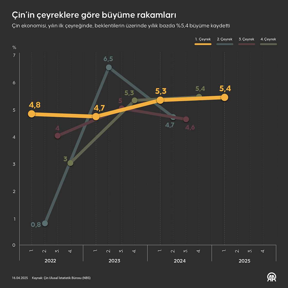 Çin ekonomisi, yılın ilk çeyreğinde beklentilerin üzerinde yıllık bazda yüzde 5,4 büyüme kaydetti. (Grafik: Elif Acar/AA)