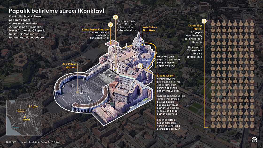 Kardinaller Meclisi Dekanı papanın cenaze merasiminin ardından 20 gün içinde Kardinaller Meclisi'ni (Konklav) Papalık Seçimi için Vatikan'da toplanmaya davet edecek. (Grafik: Mehmet Yaren Bozğun/AA)