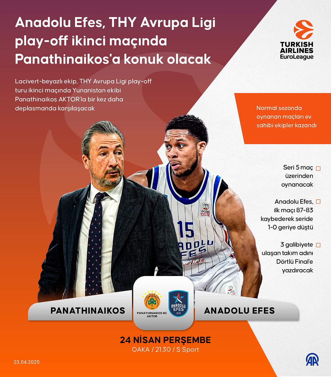 Anadolu Efes Erkek Basketbol Takımı, THY Avrupa Ligi play-off turu ikinci maçında Yunanistan ekibi Panathinaikos AKTOR'la bir kez daha deplasmanda karşılaşacak. (Grafik: Kemal Delikmen/AA)