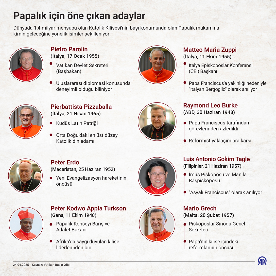 Dünyada 1,4 milyar mensubu olan Katolik Kilisesi'nin başı konumunda olan Papalık makamına kimin geleceğine yönelik isimler şekilleniyor. (Grafik: Efnan İpşir/AA)
