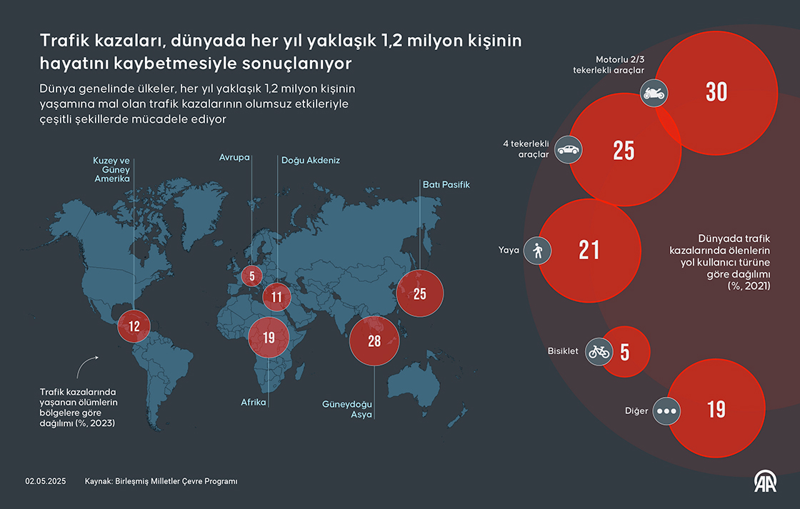 Birleşmiş Milletler Çevre Programı (UNEP) verilerine göre, dünyada her yıl yaklaşık 1,2 milyon kişinin yaşamını yitirmesiyle ve 50 milyona yakın kişinin yaralanmasıyla sonuçlanan trafik kazaları, başlıca ölüm ve kalıcı sakatlanma nedenleri arasında. (Grafik: Mehmet Yaren Bozğun/AA)02 Mayıs 2025•Güncelleme: 02 Mayıs 2025