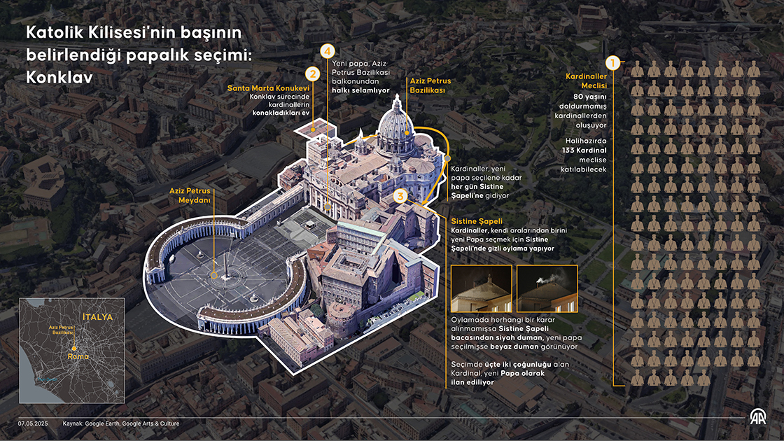 Katoliklerin son ruhani lideri ve Vatikan Devlet Başkanı Papa Franciscus'un 21 Nisan'da vefat etmesinin ardından dünya genelinde 1,4 milyar mensubu olan Katolik Kilisesi'nde gözler papalık seçiminde. (Grafik: Elif Acar/AA)