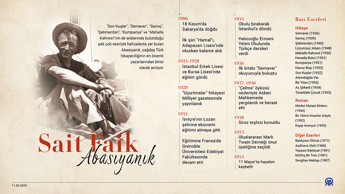 'Uçurtmalar' adlı ilk öyküsü 9 Aralık 1929'da yayınlanan Abasıyanık, 'Son Kuşlar', 'Semaver', 'Havada Bulut', 'Sarnıç', 'Şahmerdan', 'Kumpanya' ve 'Mahalle Kahvesi' eserlerinin de aralarında olduğu çok sayıda öykü, roman, şiir ve çeviriye imza attı. (Grafik: Mehmet Yaren Bozğun/AA)11 Mayıs 2025•Güncelleme: 11 Mayıs 2025