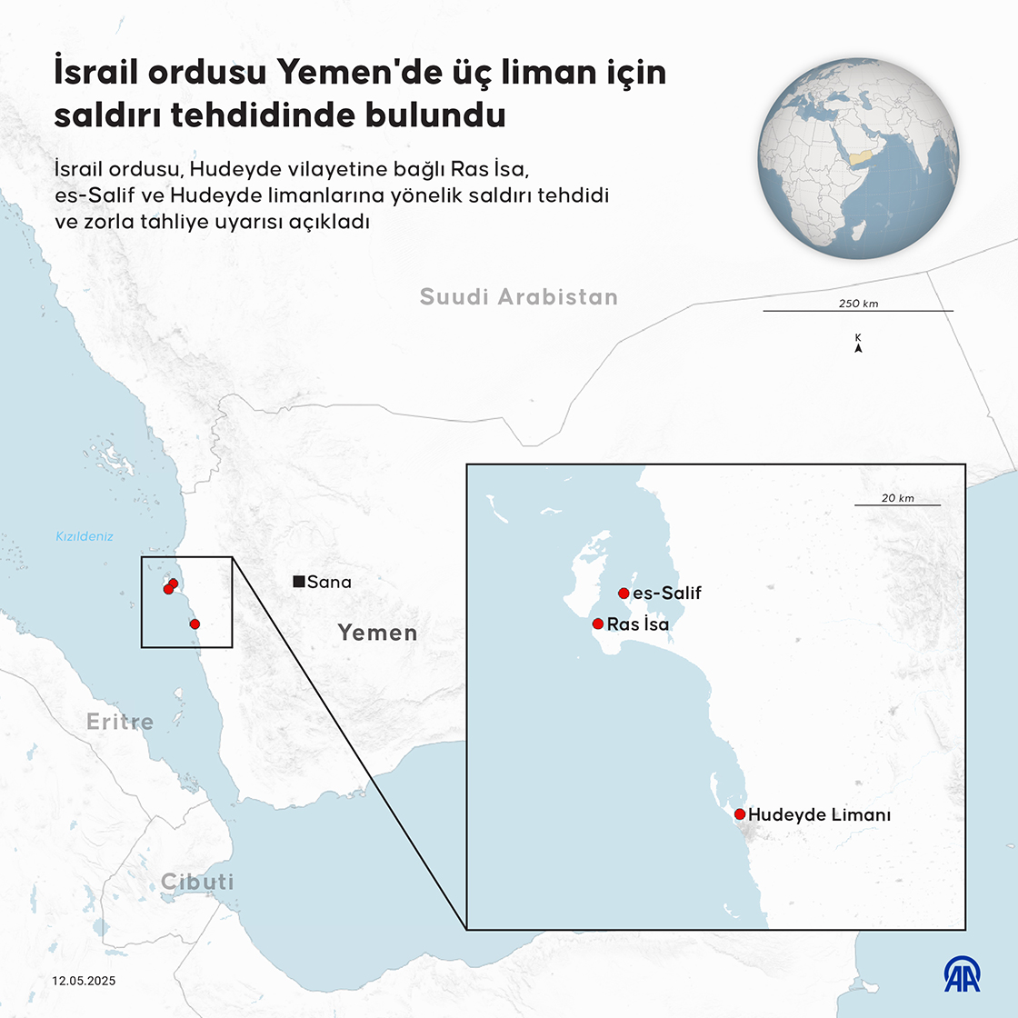 İsrail ordusu, Hudeyde vilayetine bağlı Ras İsa, es-Salif ve Hudeyde limanlarına yönelik saldırı tehdidi ve zorla tahliye uyarısı açıkladı.