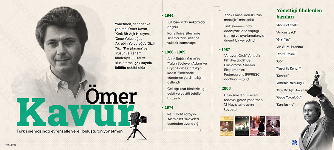 Yönetmen, senarist ve yapımcı Ömer Kavur, ‘Kırık Bir Aşk Hikayesi’, ‘Gece Yolculuğu’, ‘Akrebin Yolculuğu’, ‘Gizli Yüz’, ‘Karşılaşma’ ve ‘Yusuf ile Kenan’ filmleriyle ulusal ve uluslararası çok sayıda ödülün sahibi oldu. (Grafik: Bedirhan Demire/AA)12 Mayıs 2025•Güncelleme: 12 Mayıs 2025