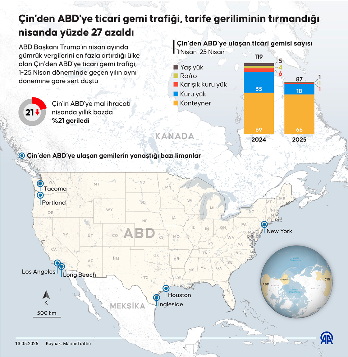 ABD Başkanı Trump'ın nisan ayında gümrük vergilerini en fazla artırdığı ülke olan Çin'den ABD'ye ticari gemi trafiği, 1-25 Nisan döneminde geçen yılın aynı dönemine göre sert düştü.