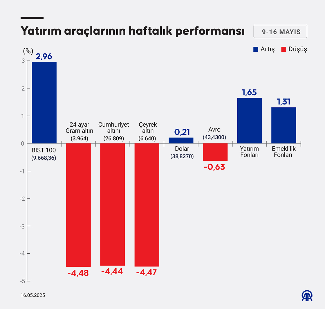 Borsa İstanbul'da işlem gören hisse senetleri haftalık bazda ortalama yüzde 2,96 değer kazanırken, dolar/TL yüzde 0,21 artış, avro/TL yüzde 0,63, altının gram fiyatı yüzde 4,48 azalış kaydetti. (Grafik: Murat Usubali/AA)