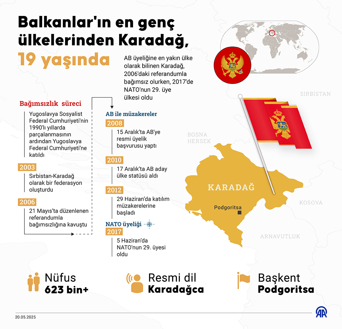 Balkanlar'ın en genç ülkelerinden Karadağ'ın bağımsızlığını kazanmasının üzerinden 19 yıl geçti. Grafik: Bedirhan Demirel/AA)