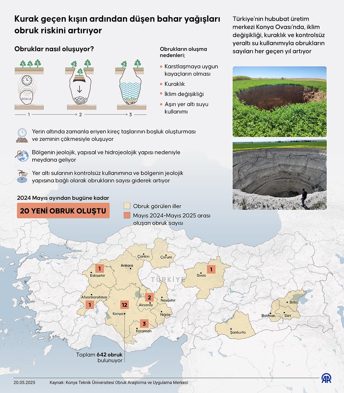 Konya Ovası'nda bu yıl, kurak geçen kışın ardından baharda düşen yoğun yağışla örtünün ağırlaşması nedeniyle obrukların daha da artması bekleniyor. (Grafik: Murat Usubali/AA)