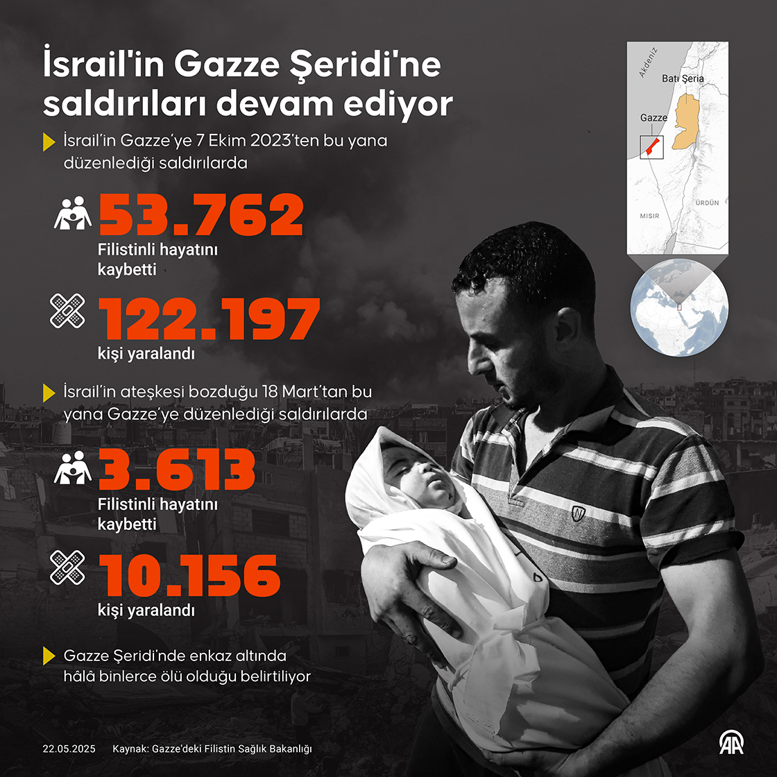İsrail ordusunun Gazze Şeridi'ne 7 Ekim 2023'ten bu yana düzenlediği saldırılarda hayatını kaybedenlerin sayısı son 24 saatte 107 artarak 53 bin 762'ye yükseldi. (Grafik: Bedirhan Demirel/AA)
