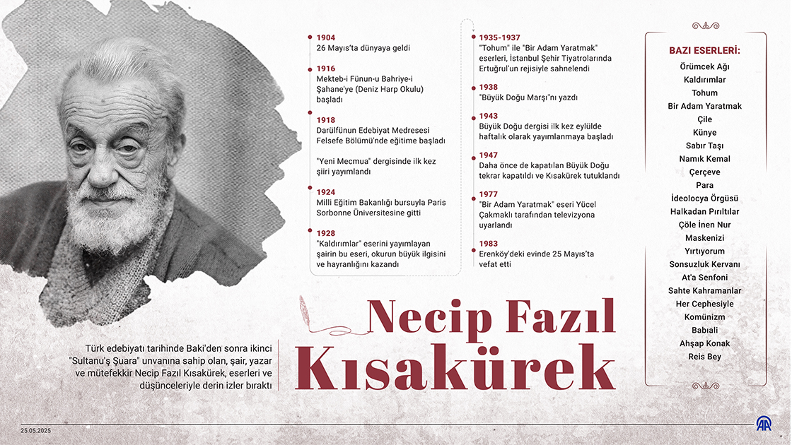 Türk edebiyatı tarihinde Baki'den sonra ikinci 'Sultanu'ş Şuara' unvanına sahip olan, şair, yazar ve mütefekkir Necip Fazıl Kısakürek, eserleri ve düşünceleriyle derin izler bıraktı.(Grafik: Elif Acar/AA)