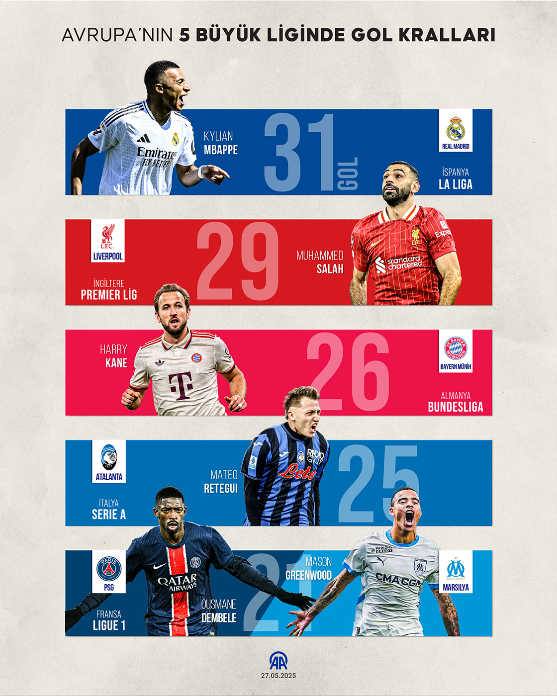 Avrupa’nın 5 büyük liginde gol kralları