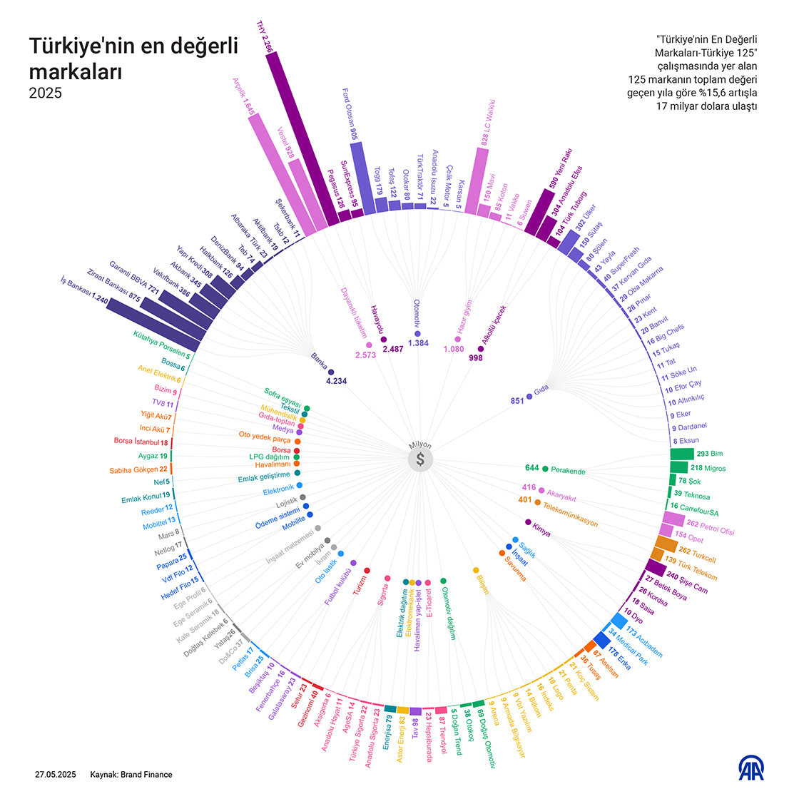 "Türkiye'nin En Değerli Markaları-Türkiye 125" çalışmasında yer alan 125 markanın toplam değeri geçen yıla göre %15,6 artışla 17 milyar dolara ulaştı. (Grafik: Yılmaz Yücel/AA)