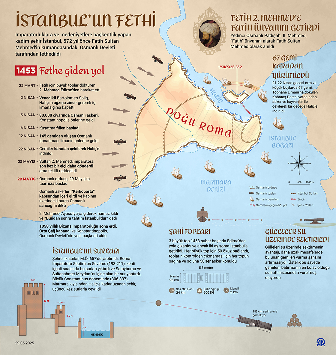 İmparatorluklara ve medeniyetlere başkentlik yapan kadim şehir İstanbul, 572 yıl önce Fatih Sultan Mehmed'in kumandasındaki Osmanlı Devleti tarafından fethedildi. (Grafik: Murat Usubali/AA)