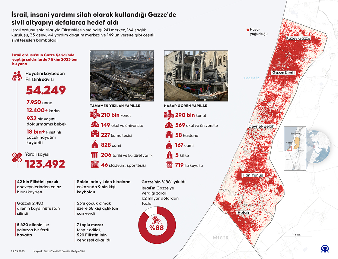 İsrail ordusu saldırılarıyla Filistinlilerin sığındığı 241 merkez, 164 sağlık kuruluşu, 33 aşevi, 44 yardım dağıtım merkezi ve 149 üniversite gibi çeşitli sivil tesisleri bombaladı. (Grafik: Yasin Demirci/AA)29 Mayıs 2025•Güncelleme: 29 Mayıs 2025
