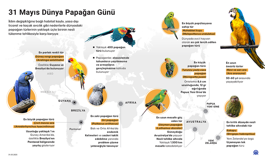İklim değişikliğine bağlı habitat kaybı, yasa dışı ticaret ve kaçak avcılık gibi nedenlerle dünyadaki papağan türlerinin yaklaşık üçte birinin nesli tükenme tehlikesiyle karşı karşıya. (Grafik: Efnan İpşir/AA)