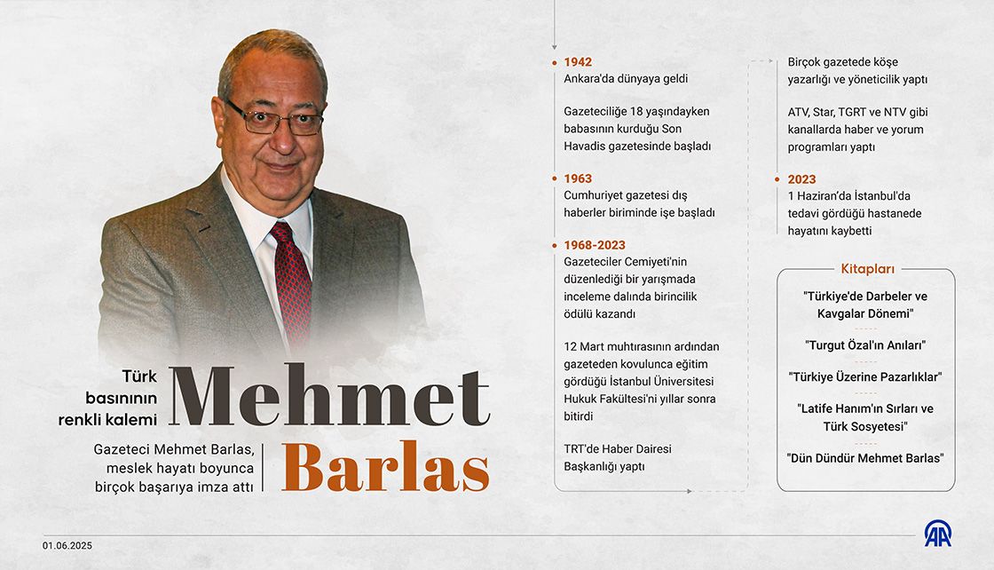 Birçok gazete ve televizyonda 60 yılı aşkın süre gazetecilik yapan, edebiyatçılar, sanatçılar ve siyasetçilerle iyi dostluklar kuran Türk basınının usta ismi Mehmet Barlas'ın vefatının üzerinden 2 yıl geçti. (Grafik: Elif Acar/AA)