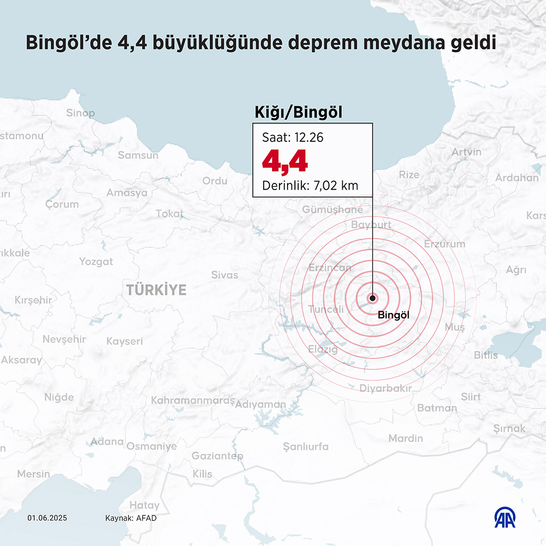 Bingöl'ün Kiğı ilçesinde saat 12.26'da 4,4 büyüklüğünde deprem meydana geldi. (Grafik: Elif Acar/AA)