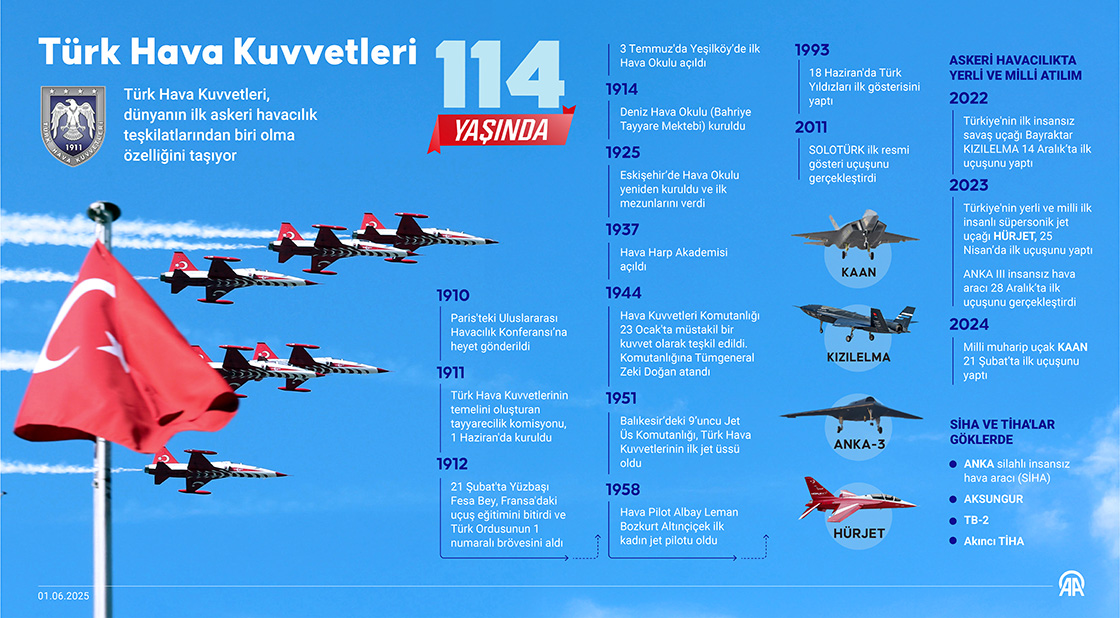 Türk Hava Kuvvetleri, dünyanın ilk askeri havacılık teşkilatlarından biri olma özelliğini taşıyor. (Grafik: Elif Acar/AA)