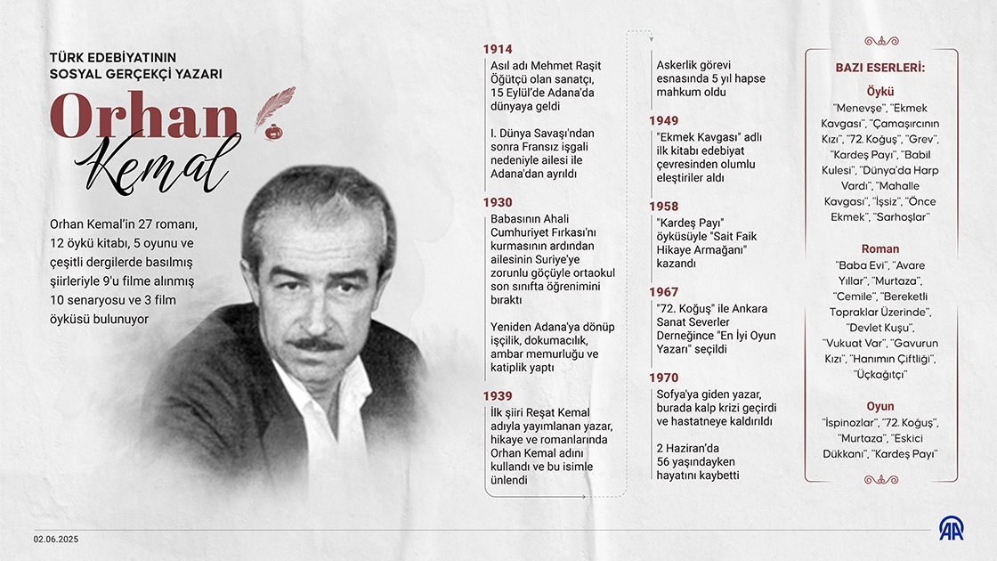 Roman, şiir ve oyun yazarı Orhan Kemal, 'Ekmek Kavgası', 'Hanımın Çiftliği', 'Murtaza', '72. Koğuş' ve 'Gurbet Kuşları'nın da aralarında olduğu çok sayıda unutulmaz esere imza attı. (Grafik: Elif Acar/AA)