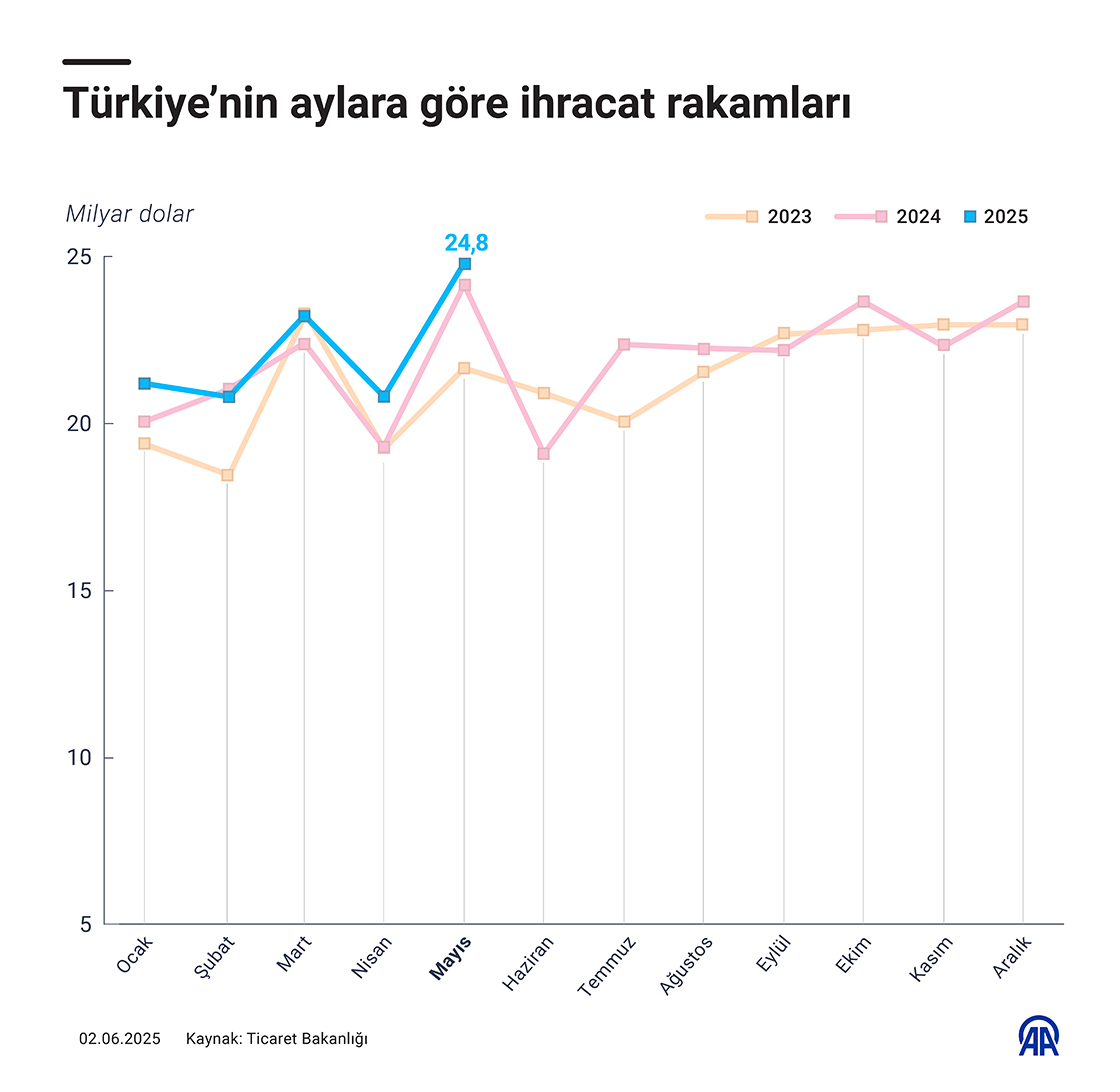 Türkiye'nin ihracatı mayısta geçen yılın aynı ayına göre yüzde 2,7 artarak 24,8 milyar dolarla en yüksek aylık rekorunu kırdı.(Grafik: Elif Acar/AA)
