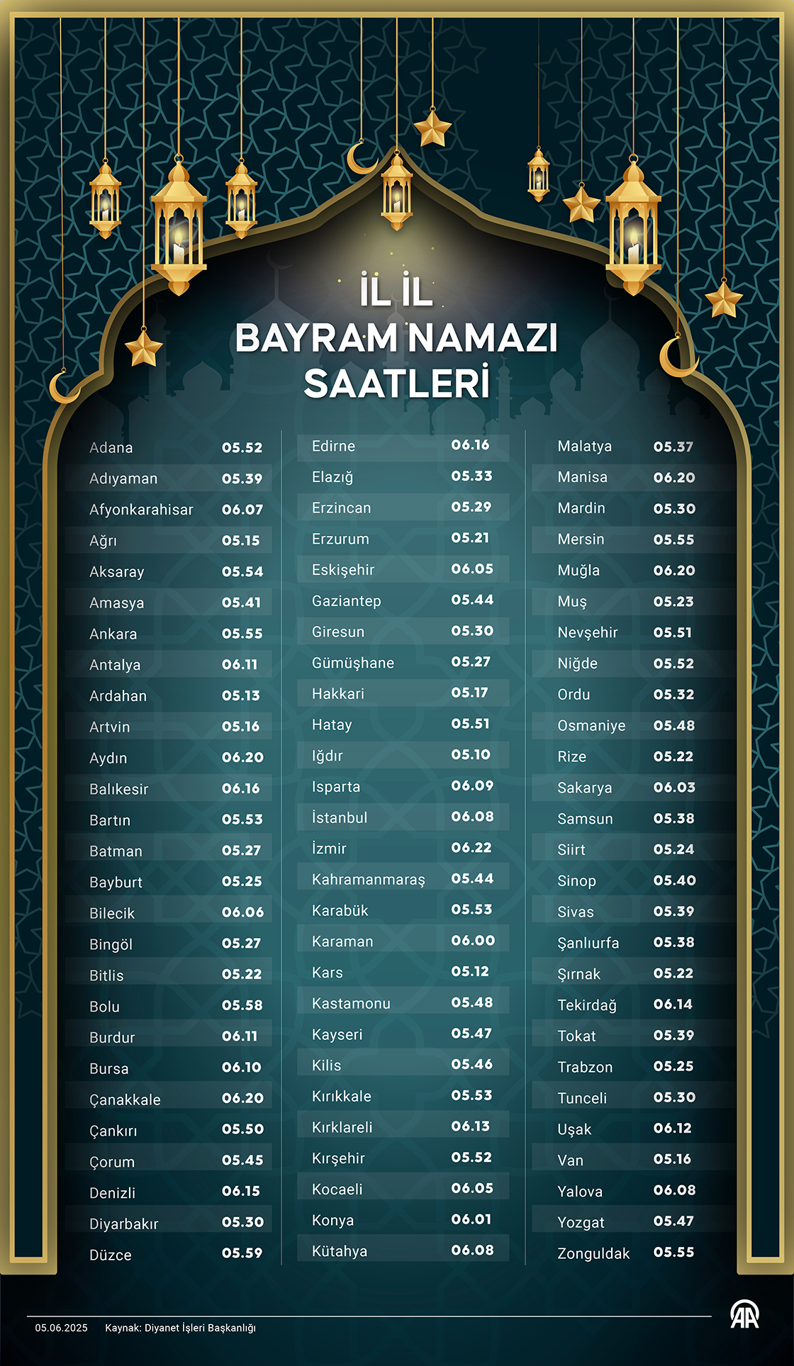 Kurban Bayramı namazı, Ankara'da saat 05.55'te, İstanbul'da 06.08'de, İzmir'de 06.22'de, Çanakkale'de 06.20'de, Iğdır'da 05.10'da kılınacak. (Grafik: Bedirhan Demirel/AA)