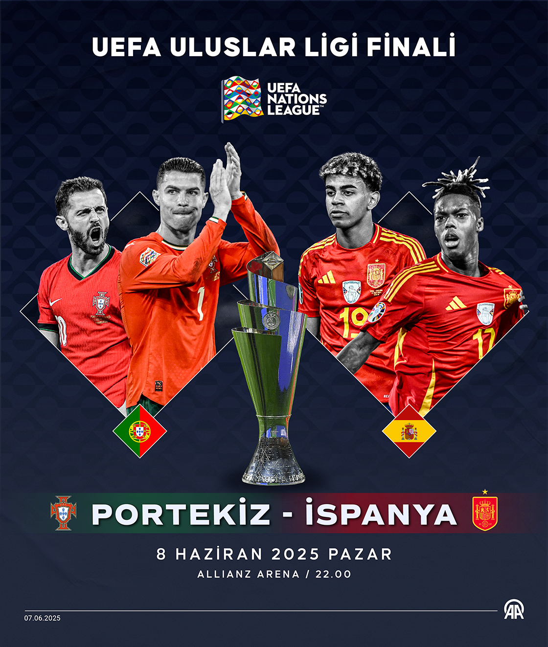 UEFA Uluslar Ligi'nde 2024-2025 sezonu şampiyonu, Portekiz ile İspanya arasında yapılacak final maçıyla belli olacak. (Grafik: Muhammed Ali Yiğit/AA)