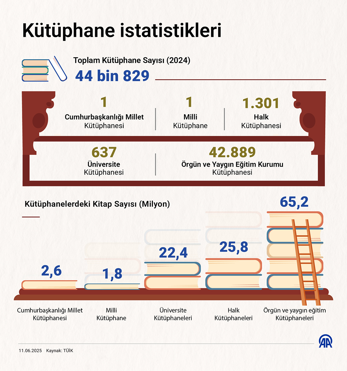Türkiye'de faaliyet gösteren kütüphane sayısı geçen yıl 44 bin 829 olarak kayıtlara geçti. (Grafik: Efnan İpşir/AA)