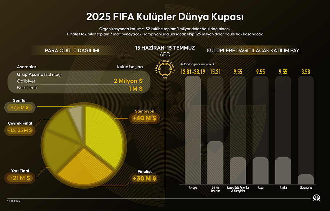 ABD'de 15 Haziran-13 Temmuz tarihlerinde düzenlenecek 2025 FIFA Kulüpler Dünya Kupası'nda 1 milyar dolar para ödülü dağıtılacak. (Grafik: Ufuk Celal Güzel/AA)