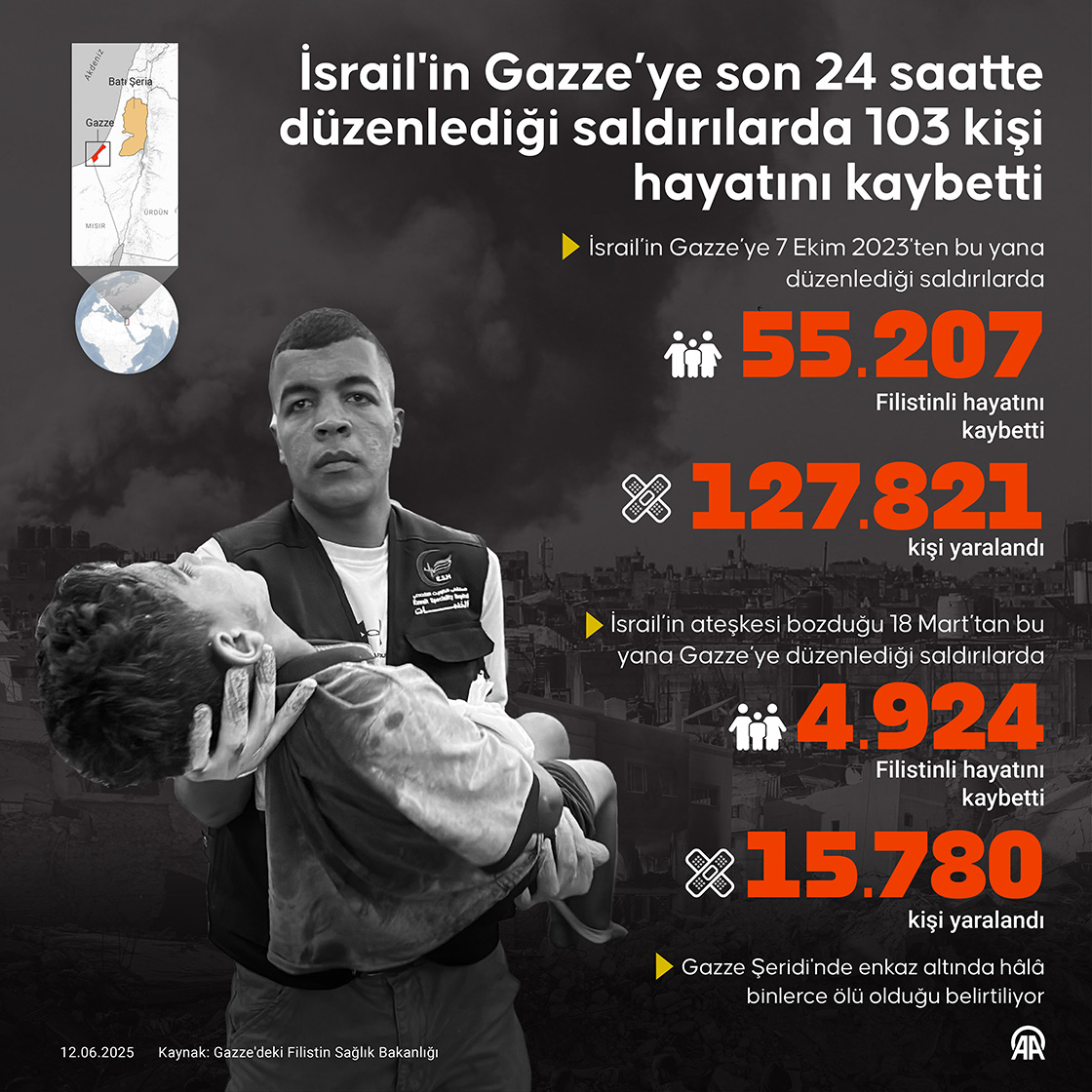 İsrail'in Gazze’ye son 24 saatte düzenlediği saldırılarda 103 kişi hayatını kaybetti (Grafik: Bedirhan Demirel/AA)