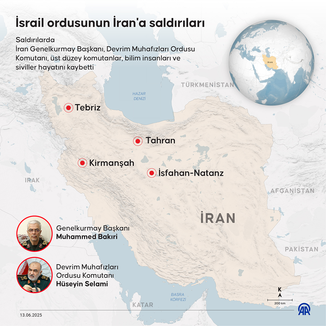 İsrail, İran'ın çeşitli kentlerine saldırı düzenledi. İran devlet televizyonu, İran Genelkurmay Başkanı Muhammed Bakıri’nin İsrail saldırılarında öldüğünü duyurdu. (Grafik: Muhammed Ali Yiğit/AA)