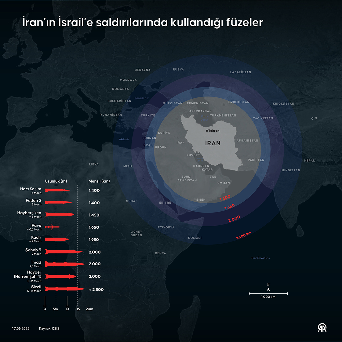 İran kaynaklarına göre, İsrail’e misillemelerde 1400 ila 2500 kilometre menzilli hipersonik ve süpersonik ile uzun menzilli füzeler kullanıldı. (Grafik: Bedirhan Demirel/AA)