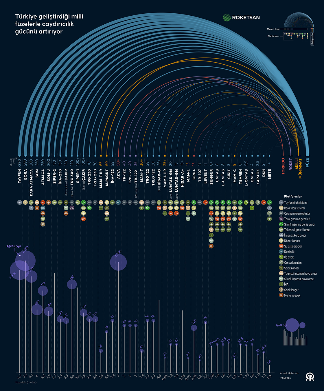 Roket ve füze üretimi konusunda uluslararası bir oyuncu haline gelen ROKETSAN, hava savunma sistemlerinden deniz sistemlerine kadar geniş ürün yelpazesiyle öne çıkıyor. (Grafik: Mehmet Yaren Bozğun/AA)