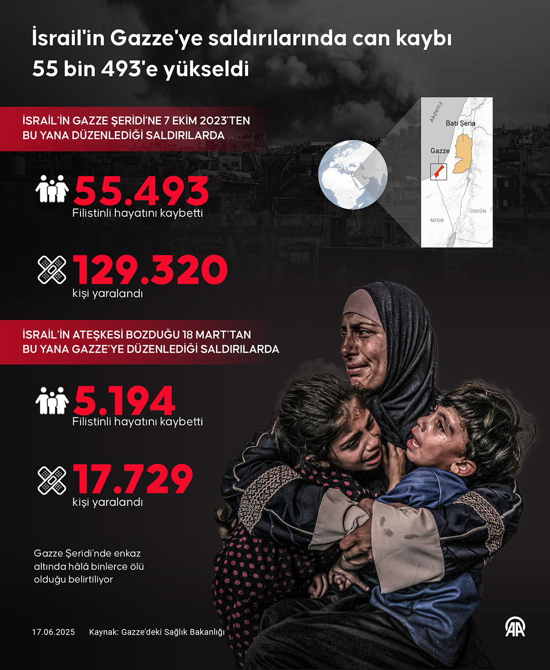 İsrail ordusunun Gazze Şeridi'ne 7 Ekim 2023'ten bu yana düzenlediği saldırılarda hayatını kaybedenlerin sayısı son 24 saatte 61 artarak 55 bin 493'e çıktı. (Grafik: Mehmet Yaren Bozğun/AA)